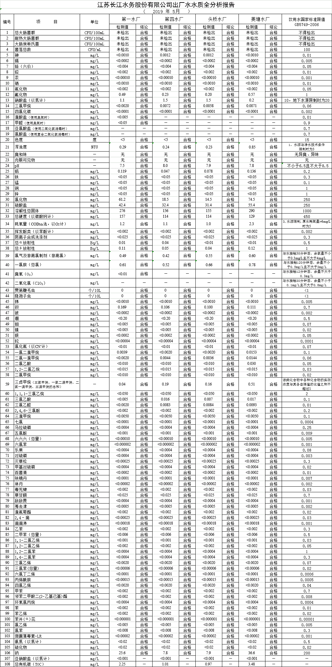 江蘇長江水務股份有限公司管網水水質報告(2019年5月)