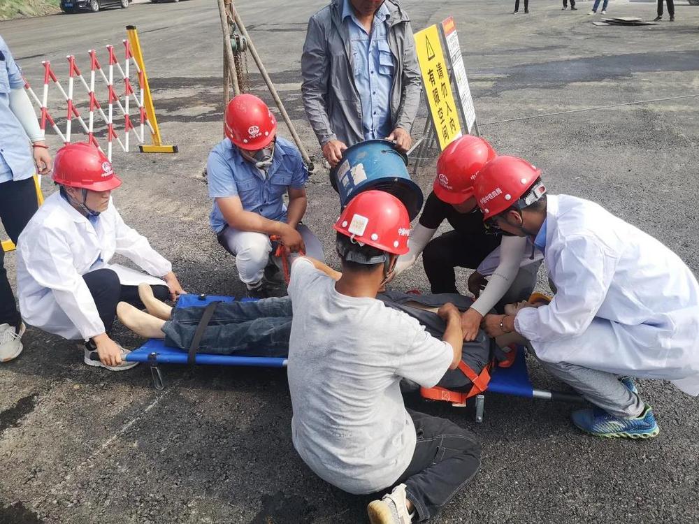 在一陣緊急呼救聲中,應(yīng)急救援演練拉開序幕:現(xiàn)場模擬了施工人員在進(jìn)行井下清淤工作時(shí),由于設(shè)備內(nèi)含氧量不足,發(fā)生了窒息事故,隨即出現(xiàn)頭暈、昏迷情況,情況十分危急!施工安全員發(fā)現(xiàn)情況后,立即上報(bào)指揮長,請(qǐng)求相關(guān)部門協(xié)同應(yīng)急救援。安全員立即對(duì)施工井內(nèi)有毒有害氣體進(jìn)行檢測,符合下井作業(yè)標(biāo)準(zhǔn);救援人員迅速佩戴氧氣罐,按指令下井搜救;醫(yī)療救護(hù)人員備齊擔(dān)架、氧氣袋、止血包扎等醫(yī)療物質(zhì),準(zhǔn)備第一時(shí)間搶救傷員。經(jīng)現(xiàn)場緊急封鎖、傷員移交醫(yī)院、施工人員清點(diǎn)、設(shè)備物資檢查等步驟,事件得到了有效處置,演練總指揮宣布此次“有限空間作業(yè)突發(fā)事件”應(yīng)急救援演練任務(wù)圓滿完成。
