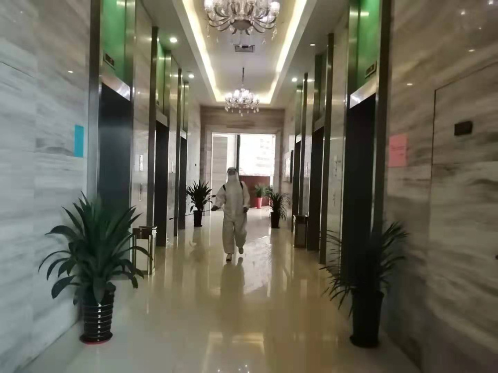 除了大廈日常運行和進出管控工作外,為進一步減少人員流動,防疫的另一項重要工作——消殺,也由項目駐守人員接替保潔來完成。他們通過電話和視頻向保潔人員詳細學(xué)習(xí)了消毒的方法,消毒工具如何操作,哪里需要大面積噴灑,哪里需要用消毒液擦拭……兩名工作人員在做好日常巡查、維護的同時,每天2次對國泰大廈大廳、電梯廳、轎廂和有人員進出的樓層進行消毒,門把手、垃圾箱、扶手、按鍵也都不會被遺漏。