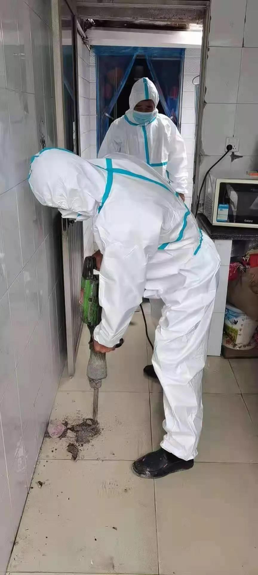 此時身穿防護(hù)服的搶修人員,渾身早已被汗水濕透,他們又將維修窗口回填,并貼好地磚,恢復(fù)原狀。遺憾的是在疫情時期,實(shí)在找不到和曹女士家一模一樣的地磚,只能使用一塊顏色相近的地磚。