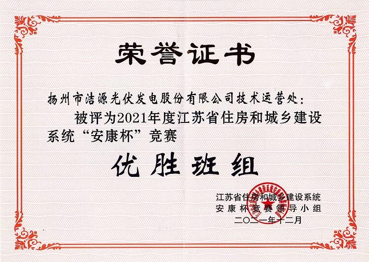 近日,光伏公司技術運營處在參加 2021年度江蘇省住房和城鄉建設系統“安康杯”競賽活動中,被評為“安康杯”競賽優勝班組榮譽稱號。