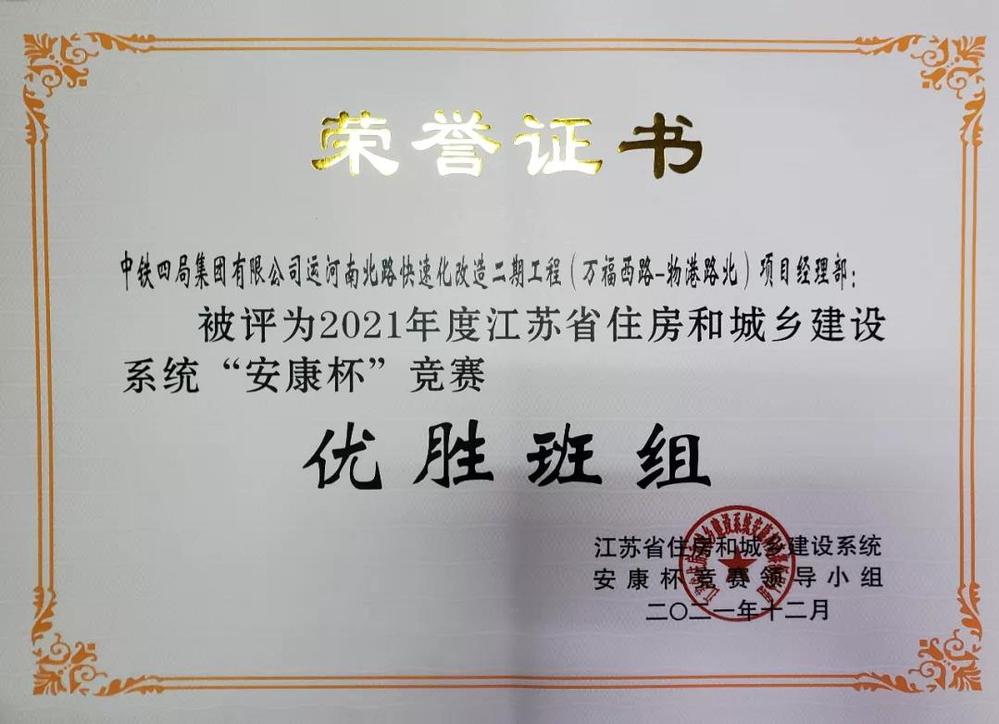 近日,揚州快速路項目運河南北路快速化改造二期工程(萬福西路-物港路北)項目經理部獲得2021年江蘇省住房和城鄉建設系統“安康杯”競賽優勝班組榮譽稱號。