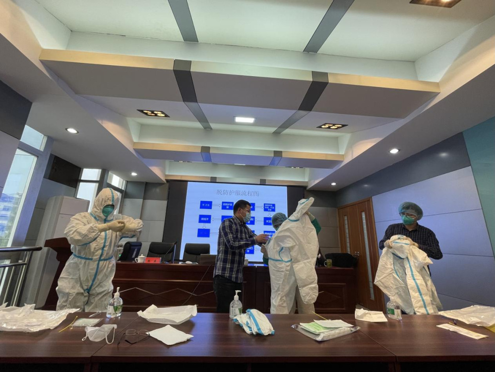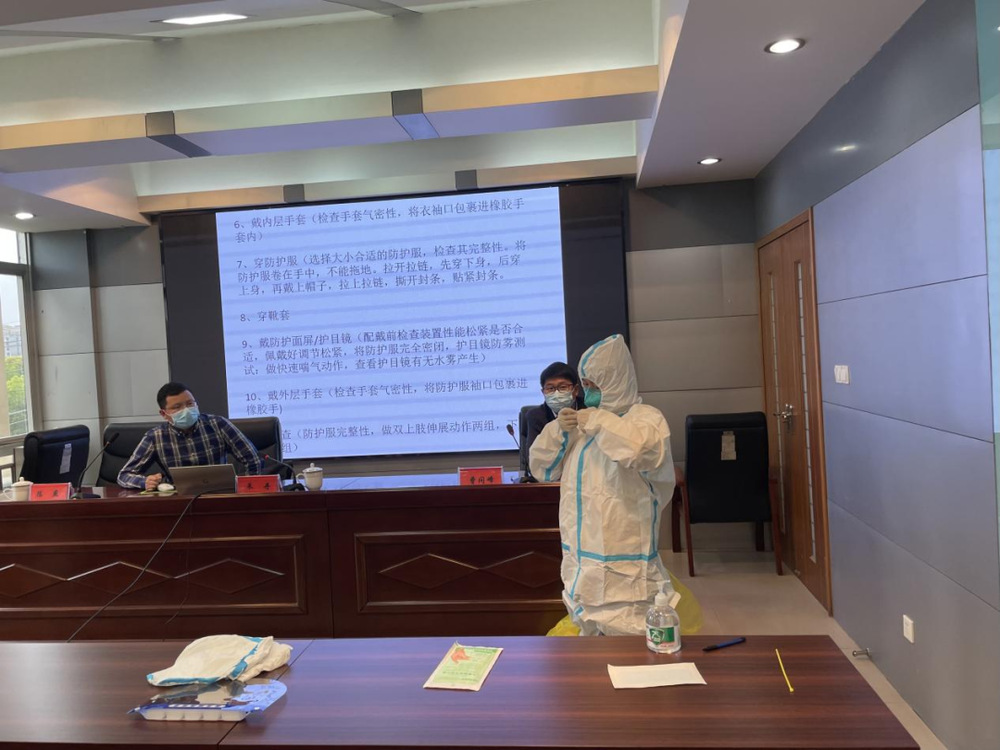參加培訓人員首先觀看了防護服穿脫流程演示視頻。隨后,市疾控中心人員介紹了正確穿脫防護服和規范使用防護用品的重要性、必要性及穿脫防護服的用物準備,并對洗手步驟、穿脫步驟、防護及消毒處理步驟等方面進行了詳細講解與指導,并現場進行了演示操作,隨后,參加培訓人員在疾控中心專業人員指導下進行了實踐操作。