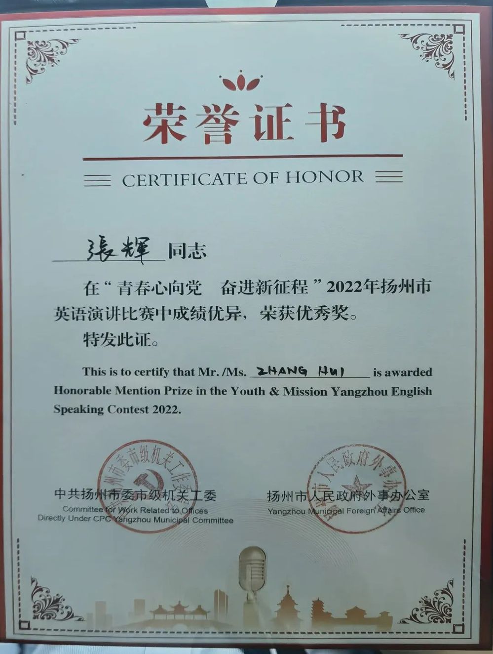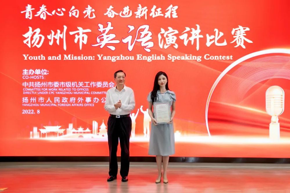 8月20日上午,在揚州市委市級機關(guān)工委與揚州市人民政府外事辦公室聯(lián)合舉辦的“青春心向黨,奮進新征程”2022年揚州市英語演講比賽決賽中,城控集團本部李韻秋同志和建盛公司張輝同志分別榮獲特等獎和優(yōu)秀獎。