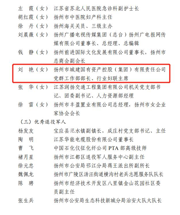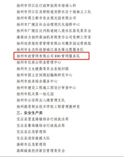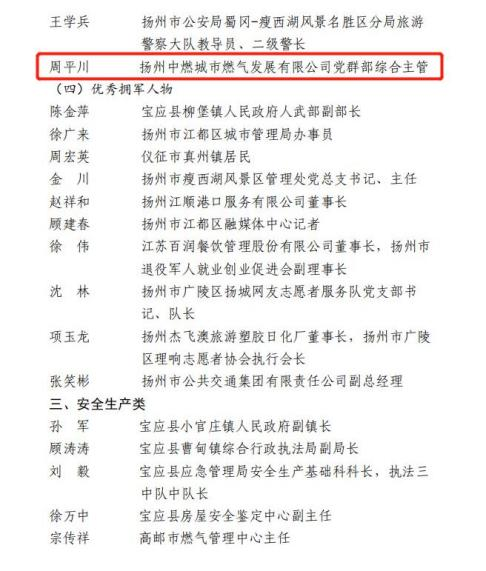集團所屬揚州市政管網(wǎng)有限公司890管網(wǎng)服務(wù)隊獲評“巾幗模范集體”;集團黨群部部長、行業(yè)婦聯(lián)主席劉艷榮獲“巾幗榜樣”榮譽稱號;集團所屬揚州中燃城市燃氣發(fā)展有限公司黨群部主管周平川榮獲“優(yōu)秀退役士兵”榮譽稱號;集團企管部副部長李剛榮獲“安全生產(chǎn)類先進個人”榮譽稱號。