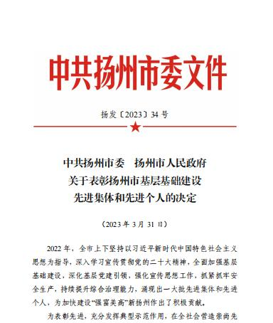 近日,揚州市委、市政府發(fā)布《關(guān)于表彰揚州市基層基礎(chǔ)建設(shè)先進集體和先進個人的決定》,表彰了過去一年在“強富美高”新?lián)P州建設(shè)中,在加強基層基礎(chǔ)建設(shè)、深化基層黨建引領(lǐng)、強化宣傳思想工作、抓緊抓牢安全生產(chǎn)、持續(xù)提升綜合治理能力等多個方面涌現(xiàn)出的一批銳意進取、改革創(chuàng)新、勇于擔(dān)當、善于作為的先進集體和先進個人。