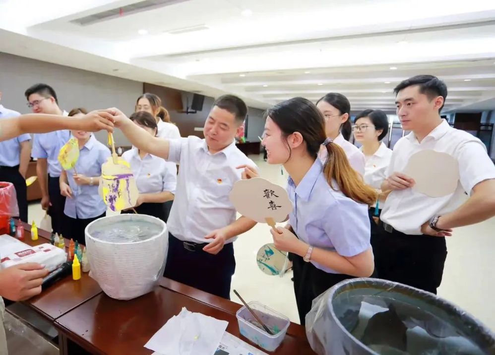以漆為筆,以水為墨。揚(yáng)州中燃公司現(xiàn)場(chǎng)邀請(qǐng)所有參加人員,動(dòng)手體驗(yàn)非遺漆扇的魅力。大家在挑選了心儀的顏色后,在老師的指導(dǎo)下,將稀釋好的色漆小心翼翼地滴灑在水面上進(jìn)行設(shè)計(jì)制作,將白色扇面緩緩浸入水中,或旋轉(zhuǎn)、或搖擺,一把把意蘊(yùn)悠長(zhǎng)的漆扇給大家?guī)砹瞬簧俚捏@喜。