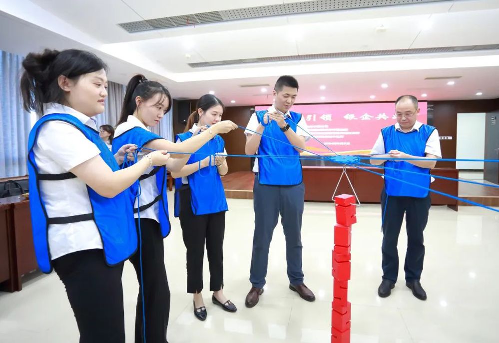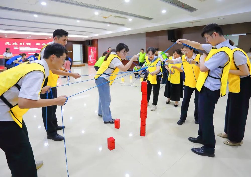 此次共建活動(dòng)在歡快輕松的氛圍中進(jìn)行,為充分調(diào)動(dòng)大家的參與熱情,在主持人熱情地引導(dǎo)下,大家首先進(jìn)行了熱身。熱身活動(dòng)后,揚(yáng)州中燃公司和三家銀行組建三支團(tuán)隊(duì)依次開展“環(huán)游世界八十天”、“達(dá)芬奇密碼”、“聯(lián)合攻城”等一系列團(tuán)隊(duì)協(xié)作競(jìng)賽。大家在競(jìng)賽互動(dòng)中不斷磨合,增強(qiáng)了彼此之間的信任感和團(tuán)隊(duì)凝聚力。“聯(lián)合攻城”作為競(jìng)賽環(huán)節(jié)的最后一個(gè)項(xiàng)目,將現(xiàn)場(chǎng)的氣氛推到一個(gè)高潮。“聯(lián)合攻城”需要隊(duì)員們同時(shí)操控手中的繩子,利用三角形的鉤子,將現(xiàn)場(chǎng)的八塊積木堆積成一個(gè)柱子,堆積過程中手不可觸碰積木,且柱子不倒塌視為完成競(jìng)賽,用時(shí)最少的隊(duì)伍獲勝。這項(xiàng)競(jìng)賽既考驗(yàn)了隊(duì)員們之間的團(tuán)隊(duì)協(xié)作能力,又考驗(yàn)了每一位隊(duì)員的心理素質(zhì)和應(yīng)對(duì)能力,大家在團(tuán)結(jié)緊張活潑的氣氛中感受著充滿挑戰(zhàn)競(jìng)賽過程和完成項(xiàng)目的喜悅。