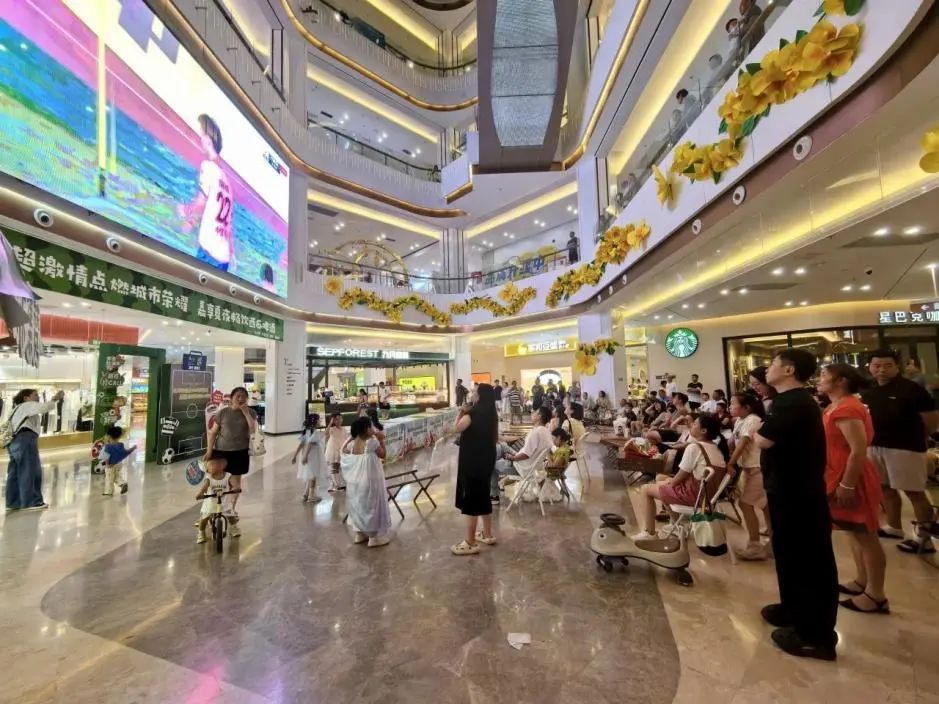 活動當日,嘉都匯中庭大屏實時直播蘇超聯賽精彩賽事,吸引周邊居民群眾齊聚一堂。大家共同感受著足球運動的熱血和激情,為城市的榮耀奮力加油,熱烈的氛圍徹底點燃了這個夏夜。
