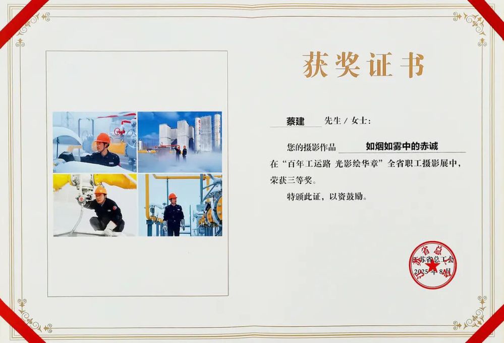 近日,江蘇省總工會主辦的“百年工運路 光影繪華章”全省職工攝影展公布獲獎情況,揚州中燃公司黨群工作部蔡建的攝影組圖作品《如煙如霧中的赤誠》榮獲三等獎。