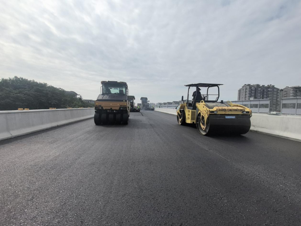 施工過(guò)程中,現(xiàn)場(chǎng)攤鋪機(jī)、壓路機(jī)等設(shè)備有序作業(yè),管理人員對(duì)原材料質(zhì)量、攤鋪溫度、厚度及平整度進(jìn)行嚴(yán)格控制,確保各項(xiàng)施工符合各項(xiàng)規(guī)范要求,為后續(xù)橋面交通標(biāo)志標(biāo)線施劃、智能交通監(jiān)控設(shè)施及亮化設(shè)備安裝打下基礎(chǔ)。