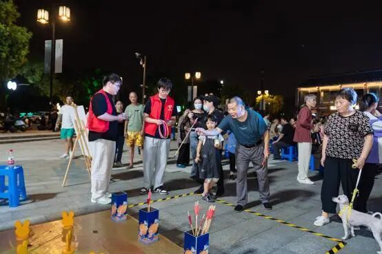 除了文化雅韻,現(xiàn)場設(shè)置了多個互動打卡與市集體驗區(qū),讓節(jié)日氛圍更添煙火氣。“我在徐凝遛月亮”打卡點前,居民手持造型精巧的月亮小夜燈定格溫馨瞬間;“玉兔投壺”游戲區(qū)排起長隊,老少同樂間復(fù)刻古代士人的閑情雅趣。“月光市集”匯集文創(chuàng)手作、中秋美食等,市民憑游園卡完成互動、集齊印章,即可兌換月亮小夜燈和冰皮月餅,將節(jié)日祝福化作觸手可及的溫暖。
